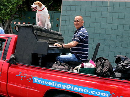 My original plan for today, forget it. Putting effort into getting on a television show for fun, is feeling like too much work. Maybe now still, it is not the time. I was going to go play today in Hollywood to be seen. The constant being in the face of everyone to get anywhere... I tried that with Oprah for the 1st two years of this journey. It didn't get me anywhere with Oprah but it did allot for me personally and was fun but... did that, done that. So, I'm really in a dilemma with focus and direction. Need to leave where I am on Monday. I so much want to settle down but at the expense of the journey? And... where, how... ugh. At the local park I created some music. People become enthralled and the Traveling Piano is irresistible for them, especially with Mo. There are so many Chinese people in this area, the rest of the country could not possible have a clue. In some places, its not only the people, its the architecture, the trees, stores, all the surroundings... everything with a Chinese feel. There are huge supermarkets with all Chinese products. For that matter same goes for Mexican and also Japanese. I want to find a way to focus on a specific direction to get the Traveling Piano to China but its so difficult while constantly decided on new places, where to stay, keeping up with being online, trying to raise money and working with the Traveling Piano everyday.