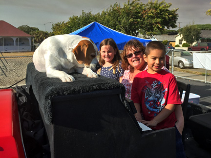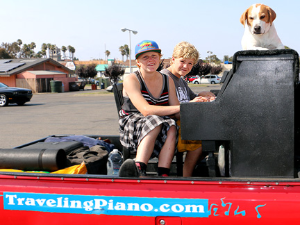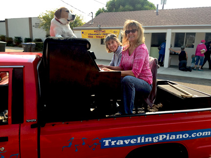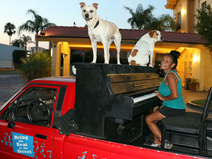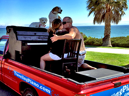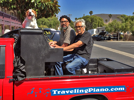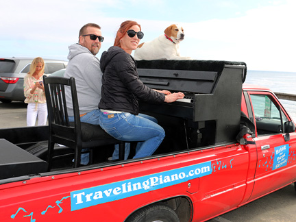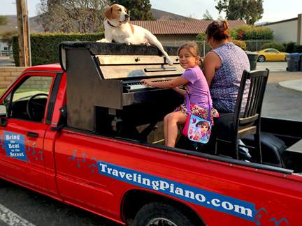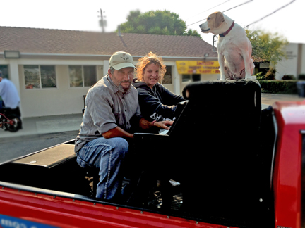 One of the house keepers from the motel where I've been staying... I got her onto the Traveling Piano today. Mo and I drove to a laundromat with a huge trash bag of toilet paper, tissues, soap and shampoo. Everyday at the motel I've collected my allotment of daily supplies and have been squirreling them away. When I was doing my clothes at the laundromat last night I saw homeless people doing theirs. So I went back to the laundromat to share some music, have an exchange of fun, friendship and respect and... pass on the loot. I ran into a perfect guy. He was there with his two young sons around ten and twelve years old. They live in the bushes down by a river bed where I visited with my last load of loot about a month ago. The boys had fun with the piano. When it came to talking about where they are living you could see the shame they felt about having no home. They took all the stuff and will share it with the community living around him. There are several neighbors living in tents and another family near them. There was another guy nearby standing looking very lost. One of the young boys came up to the dad to show him. They all went over to invite the guy to go back with them where they are staying. Homeless people taking care of each other... then lastly, at a pizza parlor in a strip mall a couple noticed the strong colors of the Traveling Piano truck and so I engaged with them for a few minutes while they waited for their pizza. They didn't know what hit them as I sort of came out of nowhere fast and strong, swept them off their feet and onto the piano seat.