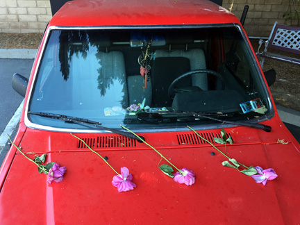 After I posted the blog last night... in not the greatest state of mind, I took Mo outside for a short walk and on the hood of my truck found four purposely laid lavender roses. It felt like the Traveling Piano had been carpeted with roses. They were full of validation, love, appreciation and reassurance for me. Its the second time someone left flowers on the truck. All unwanted thoughts disappeared instantly. I felt love. The anonymity of the gesture is so very special. Also, this morning I was reminding myself how I am alone and must cope with that fact. Then, almost immediately a friend called. No one has called in weeks. I don't know whats that all about except for the powers that be reminding me that I am not alone.