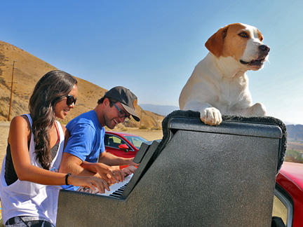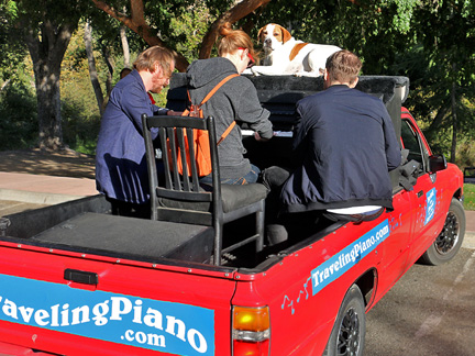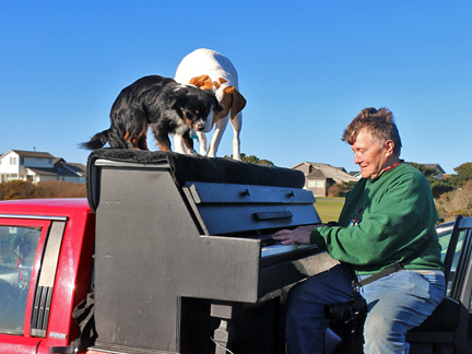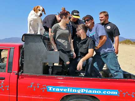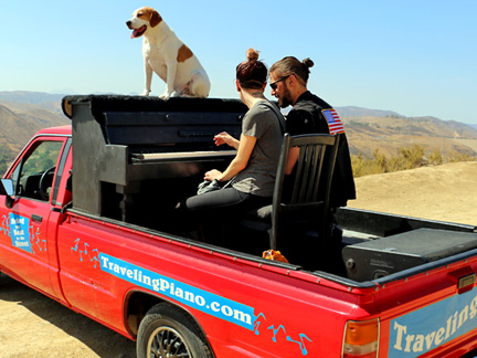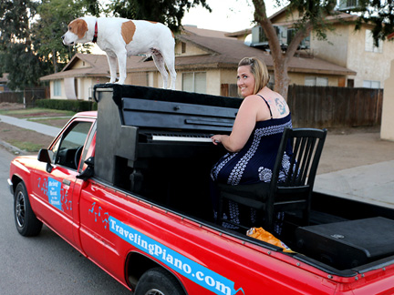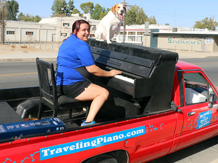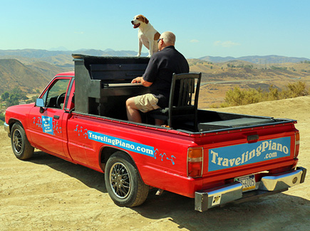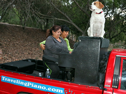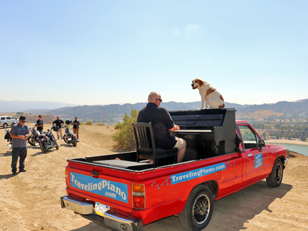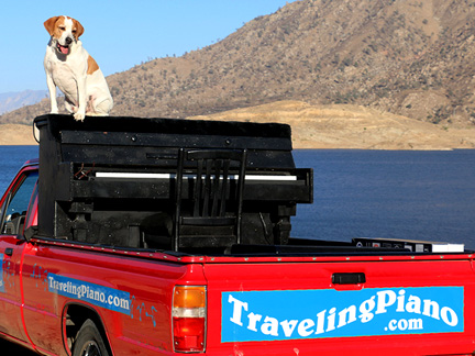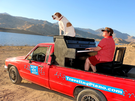I said to the guy who was telling me, it is no different in cities with neighbors peering through windows. Once they get their rocks off and stimulated enough, the newness wears off. Knowing that I am being watched tempts me to create a show. The less attention the better. We say hi, be friendly, then keep to our own business. Another neighbor has been living here since he was ten years old, a retired military guy with his wife. The guy next to me originally from Canada, an oil guy living in Bakersfield during the week with his wife wanted to make sure I'm not a squatter and gave me permission to walk with Mo up his mountain. We talked about the Traveling Piano being in Sandy Hook, CT after the mass shooting there and how he is interest in the conspiracy theories surrounding it. I said the conspiracy theories people are creating in today's world dehumanize our existence. I went to create some music in the driveway and Mo could not wait to jump up into his spot on top of the piano. As I began to play he just melted in total comfort. My music soothes him more than my talking to him. I can tell beyond any doubt that my dog totally appreciates and respects me. How great that is to know one hundred percent and to be able to trust. It is very great!