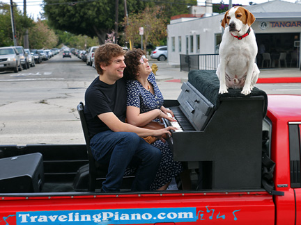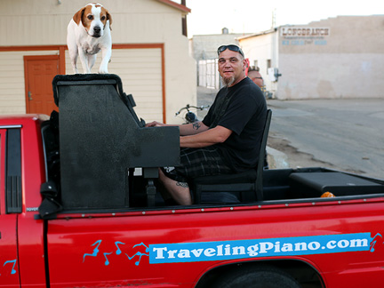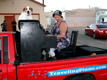 Today was ok, my mind moved along very slowly. I'm having difficulty with the clarity of what I'm doing in the moment and am having small short impulses of pending panic attacks. The good thing about this is that I am aware. Life's a challenge right now. It truly is not in my hands except for what I can do. I'm consciously doing everything I can. There is no choice but to let God handle whatever else is needed. Looking into room shares, apartments, sending out requests for contribution, working on a specific plan for some future security while still having fun living life in meeting people with the Traveling Piano... straightening up my papers, it was a full day. The relief, when I got back inside my cool, clean air-conditioned motel room after being out with the Traveling Piano, was amazing. It felt like I came in out of hell. Its so hot and dry and dirty outside with people everywhere walking around looking lost. Most are. Everyday day is a hundred degrees and how dirty is it? Well, the air... with no wind or blowing dust from anything, I came out to find I can write my name on the Traveling Piano's hood from two days of sitting. The pollution particles in the air are very thick. As the air settles overnight everything gets covered in dirt!
