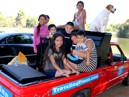 Mo and I drove to three parks looking for a good location to just sit and create music. Finally I just pulled in a random parking space that was in the shade. It was in a down and out park area. Homeless people walking buy thanking me saying how good the music was. A group of kids got on and immediately grasped the concept of playing the piano. There were other kids under ten years old running around on their own. I wanted to let them onto the piano also but sadly, did not want to risk trouble as there were no adults present. A family drove in with a van to share some good wholesome quality burritos with people in the park. Just how awesome is that! It made me feel so good and of course I took one. They had three or four young children in their van with them... what an example for the kids. This is the second time I've experienced locals in Bakersfield taking care of people, strangers in a park. It is very validating for me. I fell into the perfect spots at the right times today. The first couple I met, we sat in the shade in the grass and just talked for awhile. That felt really good.