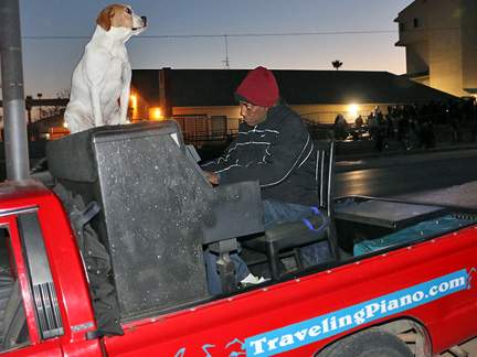 Always, I'm having moments of Traveling Piano with people when out and about. A security guard in a shopping center parking lot recognized me with interest and so we met formally in a personal way with musical fun, friendship and respect. Today, I let go of my plastic gallon water containers. I always travel with at least three gallons of water because in some places the water is too foul to drink and well, I've easily saved a thousand bucks not buying bottled water throughout this journey. Also today, I purchased a small philodendron for my room. Thats a major settling down gesture. Lastly, I've been needing a lot of sleep and need to keep saying, "I live here." When I talk to people wow, the story is changing fast. For example, saying I have lived (past tense) on the road for eleven years is a lot less stimulating than saying I'm living on the road and have been on the road for the past eleven years.