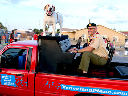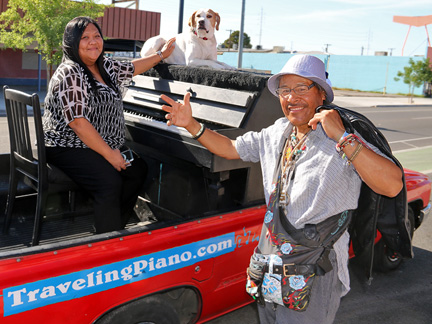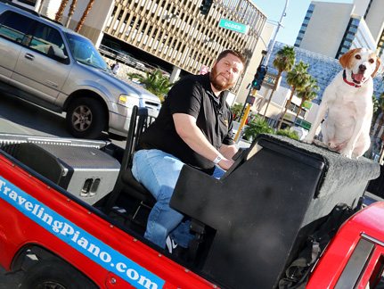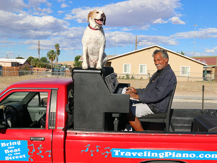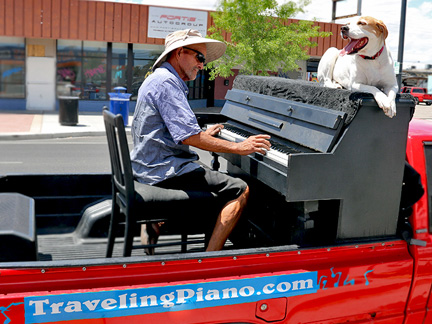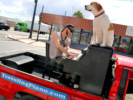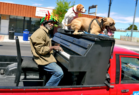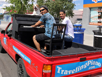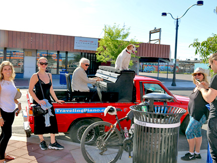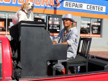 Saturdays on Main Street in Las Vegas, Nevada with the Traveling Piano, ha! Mo and I parked ourselves on the corner of Utah and Main for five hours! A few neighbors came by, some people who wanted to meet us from online, a few guys who live on the streets and some out of town visitors. I am exhausted. I was thinking how right from the start with this on the street Saturday commitment how I must monetize the situation from the start but in keeping with the Traveling Piano's mission statement, how? Well, first I need to get some of the journey's photos into a few galleries to sell. I'll be meeting with two printers and a gallery curator on Tuesday. Where the money is going to come from to print the photos, I don't know because I've got to make the rent for next month yet. I talked to the pizza guy behind where I live and suggested on a whim that I put some photos in his shop to sell. He said, why not? That got me thinking how I could get photos in lots of different business places and that would give me an excuse to be able to promote them. I want to people come out and onto the streets downtown with a sense of community. But, I must stay focused on step one... get the product made. Sell it to pay the bills and to make more product. On the street I heard some amazing stories today. A woman was sweeping the street while telling me how humiliating it was for her to be doing community service for a DUI because, she has to wear a huge yellow vest with big black letters printed on the back... DUI.