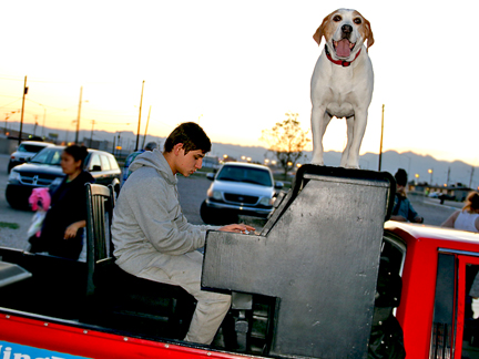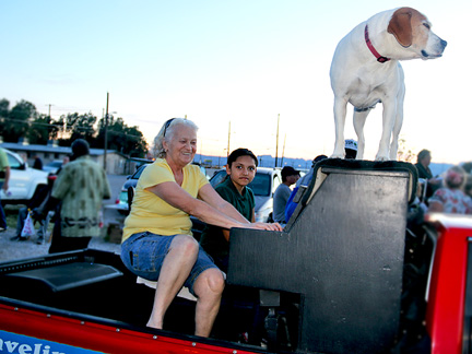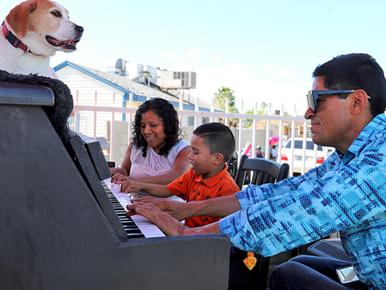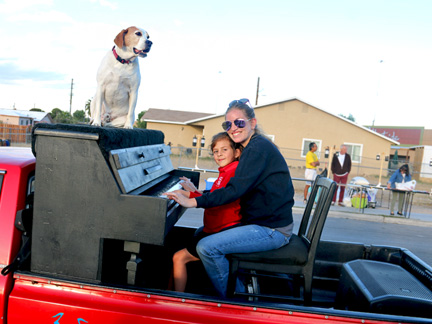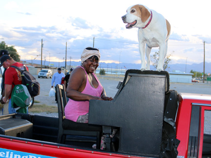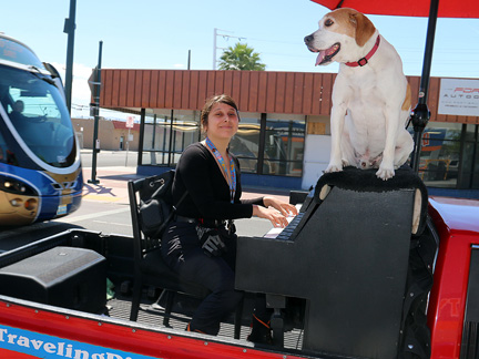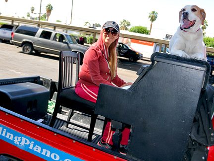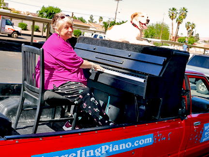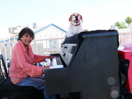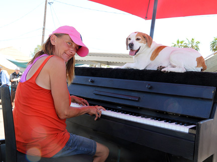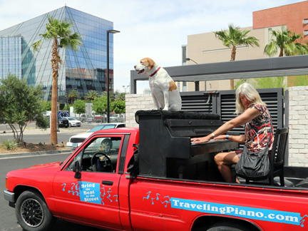 My back is giving me problems and that is why I think I'm tired. A guy named Clark who works the Red Rock Canyon toll booth is a piano player in a band named the Rockin Blues Squad and I've known him for two years now from the canyon but he's never been on the Traveling Piano. Today was the day! His band was playing a community health and resource fair and so Mo and I stopped there for awhile at the end. It was super warm. We met several fun people there. Afterwards I took Mo to the dog park and he could not have been happier but wow, was he tired. We are going to live everyday as full as possible. Piano dog Boner helped me to live in the moment and now with Mo... I'm going to practice that even more and be very careful concerning the heat.