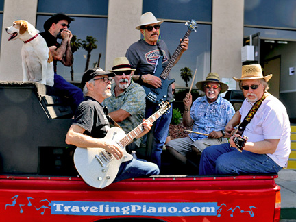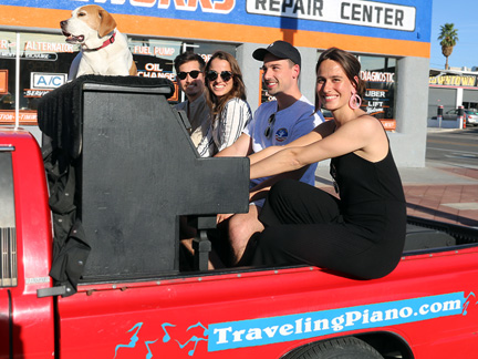 What a beautiful day it was with the temperature and feeling of the air. There was just a little too much sun at mid-afternoon for about a half hour. Other than that... perfect. We camped out with the Traveling Piano curb side around the corner from where Mo and I live on Main Street outside Quality Autoworks for their Grand Opening Day here in the Arts District. Denise the owner has offered to take care of repairs for the truck and I wanted to show my appreciation. We began at ten in the morning and ended at six in the evening. I am amazed I had the energy to last that long. When I love what I am doing my spirit has unbounded energy, even with my back bothering me. There could have been some great music recorded but that part of the piano has broken.