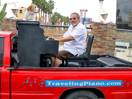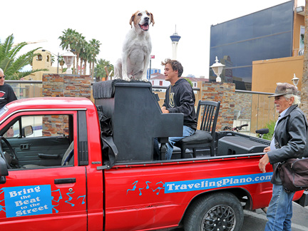 Mo was such a good dog all afternoon I had to take him for a good long walk. We walked up to Fremont Street, which is crazy town here in las Vegas. For the first time in two years, I walked into an out cove of the street that does not get much foot traffic as I have often thought it would be a great spot for the Traveling Piano if I was to venture back into making money. I just wanted to get another feel for the spot. There was live piano music happening, very good piano music. Right in front of me was Don't Tell Mama, a famous Piano Bar and Cabaret that started out in New York City back in the 80's. It had moved to Fremont Street in Vegas some years ago but I saw it closed down a few months ago. That is because it moved to right where I was standing. And the owner was standing a few feet away so I met him. I said I'd like to speak to him about using the Traveling Piano to help promote the place. There is minus zero interest in performing or entertaining but I would have an interest in helping to market and promote. He took my card and said he would call me. So, there are always many possibilities floating around in my world. I just need to stay calm, breath, put one foot in front of the other and keep going to find my destiny as in... death. And, have fun doing it.