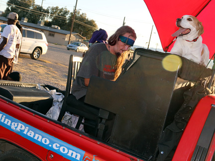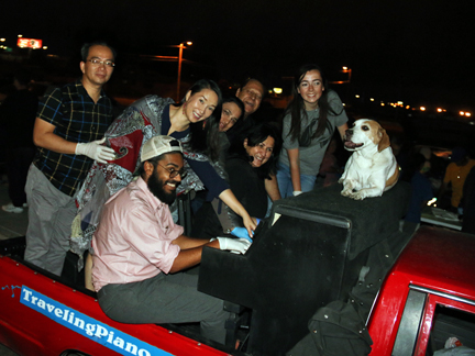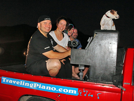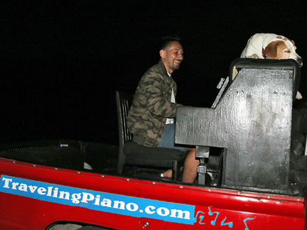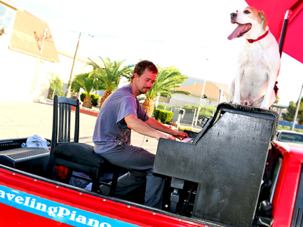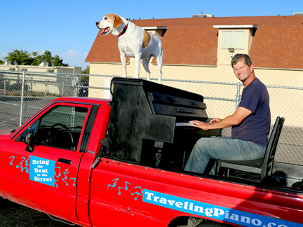 I am piano man Danny Kean, the sole proprietor of the Traveling Piano. My pup Mo, he hangs out on top of the piano with me. We create music for people to discover through synchronistic spontaneity. Whether on a mountaintop or on neighborhood street, when people find us they are empowered to try the Traveling Piano for themselves. Over 90,000 individual people have created music on the Traveling Piano, most of them while creating music for the very first time.