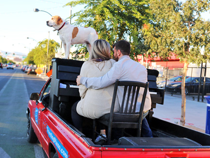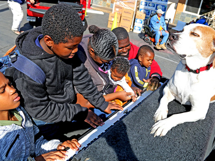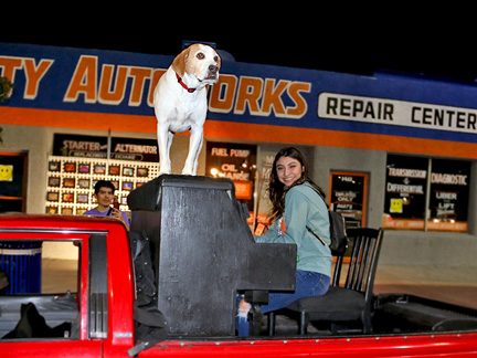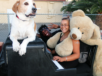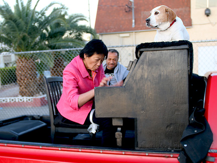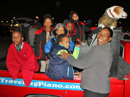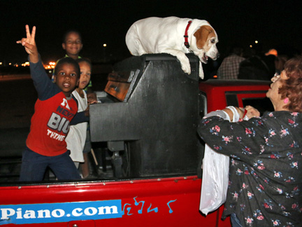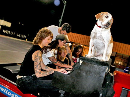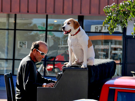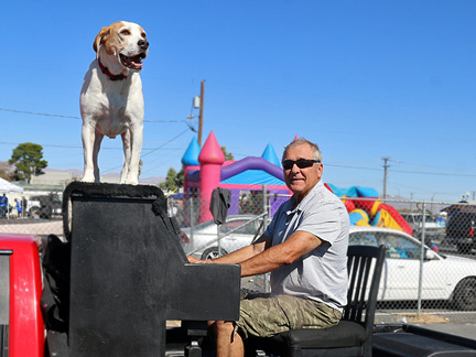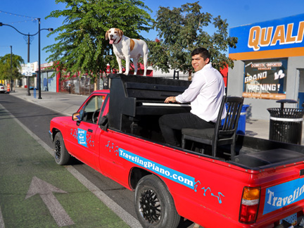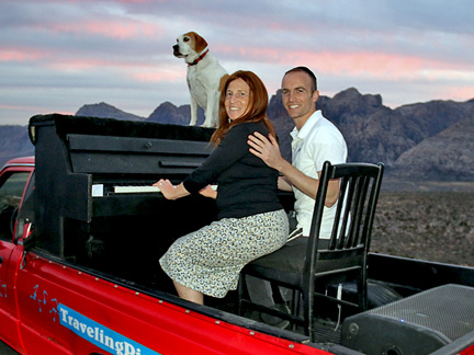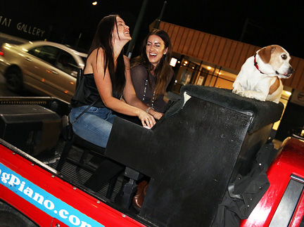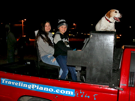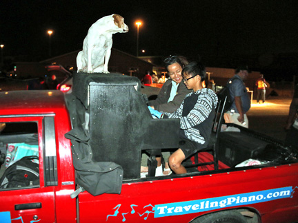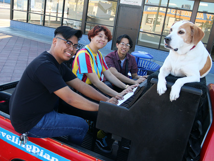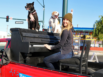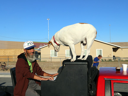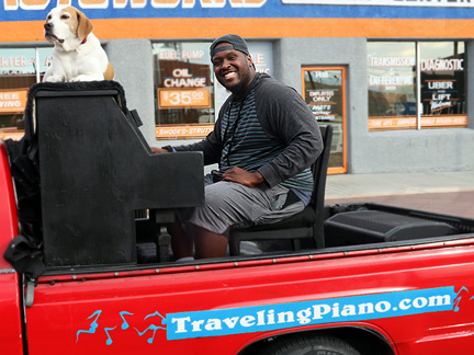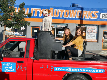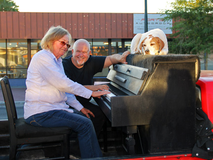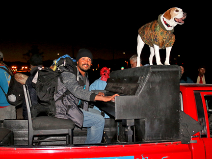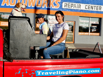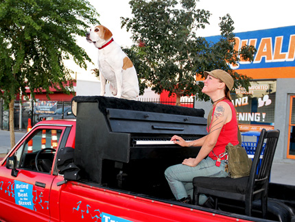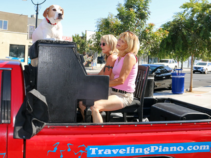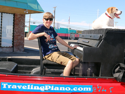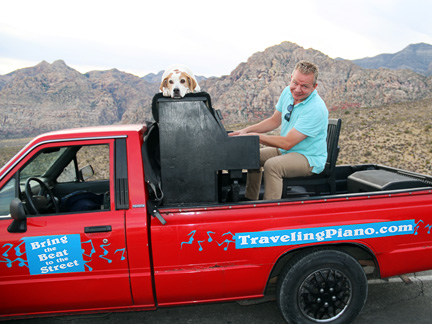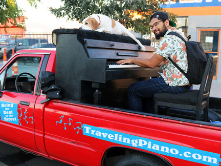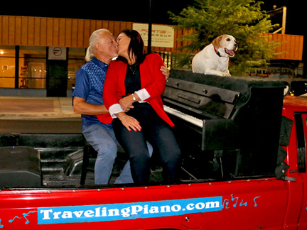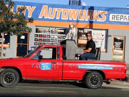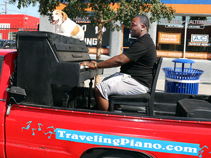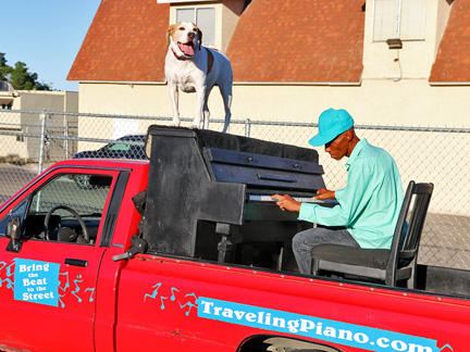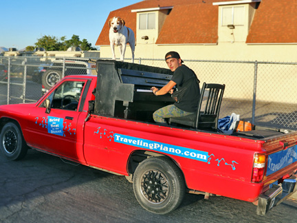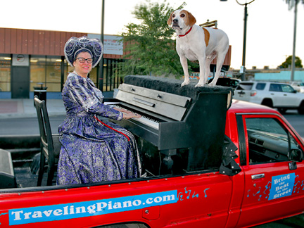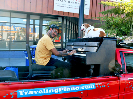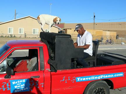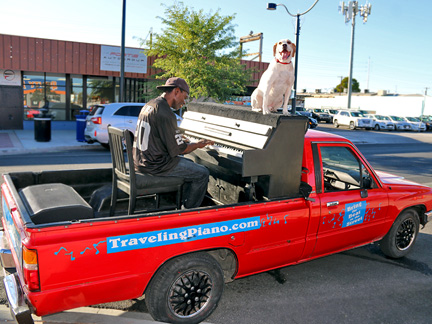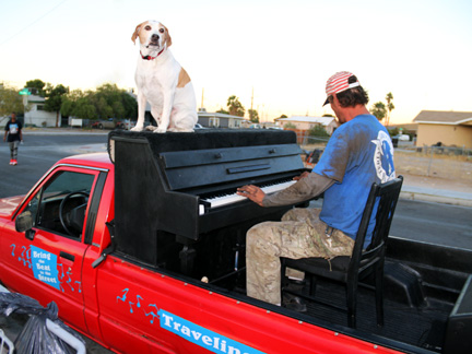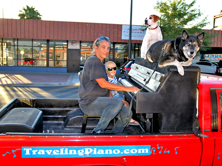 6. The Traveling Piano has created support and healing for some of the nations most tragic events. 7. Over 90,000 people have been on the Traveling Piano's seat and 99% of the interactions have been through synchronistic, spontaneous encounters in both rural and urban areas. 8. A Piano Dog named Boner hung out for over fifteen years with the Traveling Piano. 9. The present journey has been documented every day since 2006, the Traveling Piano website has over 80,000 photos and 4,000 individual pieces of music on it. 10. The Traveling Piano is all about sharing musical improvisation, encouragement, inspiration, fun, friendship and respect with the idea of strangers becoming less afraid of each other.