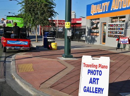 The Traveling Piano was perched outside on the corner for eight hours today. Mo and I spent the time both indoors and out. I hung my pictures inside because of the sun. I sold one for $20 the entire day. The plan is to go out every hour on the hour and play for twenty minutes and spend the rest of the time inside my "store" doing this usual computer work and trying to make a buck. Ugh. The fun was in connecting with neighbors, visitors in the city as well as locals. I've been meeting a lot more Las Vegas residents in general now that the street is starting to create walking traffic and the weather is better and of course, it was saturday. At least I got up at a decent time today and went to work even if it was for two bucks an hour. They are my hours in my way and now the trick will be to build them into money... quick.