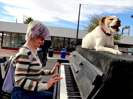 I have not sold one photo online. Whats up with that? The fundraising has slowed because I'm just too out of it physically to do much. Thank God i have the months rent. I'm feeling a little detached from Mo even though he is by my side 24/7. Life is not like it was. There is less nature, hiking in the desert, play in the woods like earlier in life, our travel and one on one time with people we visit.I do my work now sitting down in a chair. It used to be in bed on a recliner with him between my legs. We are more and more in the same spot on the street with the Traveling Piano or at the Mission Center. The variety of changing environments and places has been a big part of stimulating our interests, exploration, and new experiences with each other. Adjust to change has never been easy for me and so I know it is not easy for Mo. We just keep truckin' on. Everything is as it should be, I think.