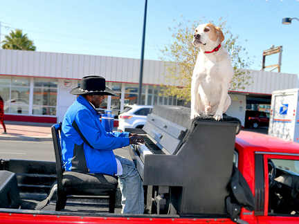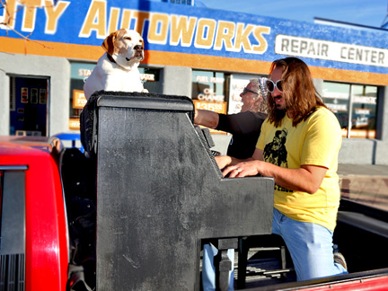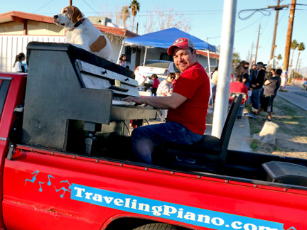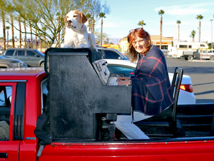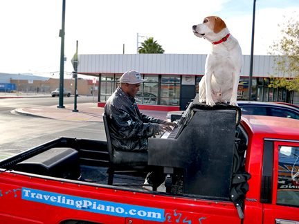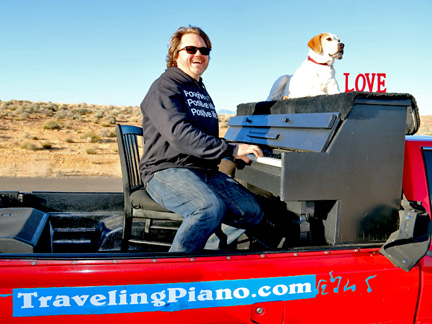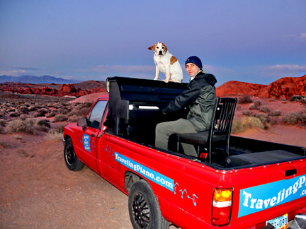 I got up feeling able to go for a walk with Mo so we headed out into the desert. It was nice and sunny and breezy until... a wind storm came up. Oh my God, the dust and sand blowing as we ran back to the truck. I was more afraid of the hood blowing off then anything about the piano. Right now the winds are gusting to 50-70 miles an hour. Earlier, I got caught up with ranting online about a local Catholic church that has no loitering signs out front, doors locked except for mass, and armed security. Looks like I am going to have dinner with the woman I was ranting with and her family sometime this week to talk. I was going to play music today for people at an overlook with the Traveling Piano but... too much wind! This journey began, the... Flight of Peregrinating Musical Exploration in February of 2006 and I have a blog entry here on this website for every day since it began.