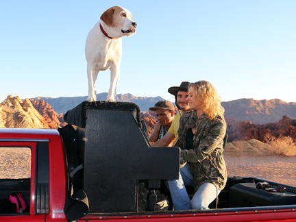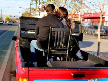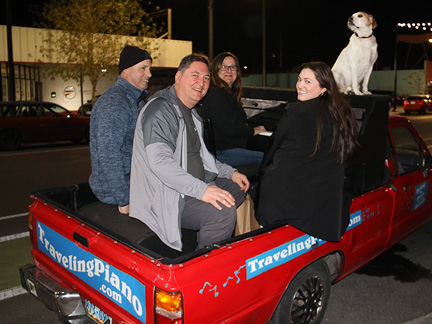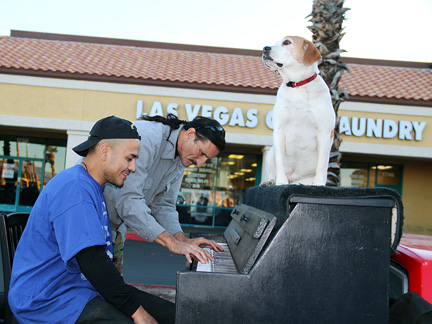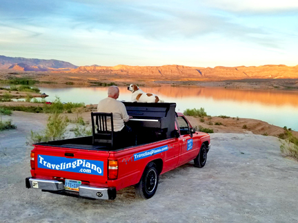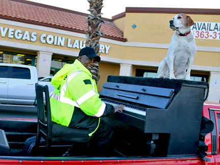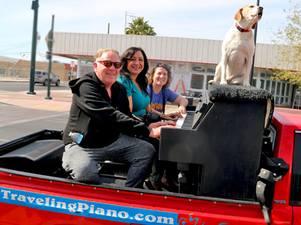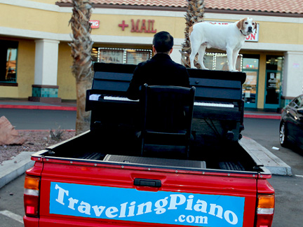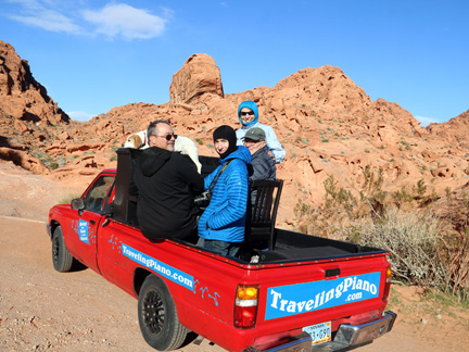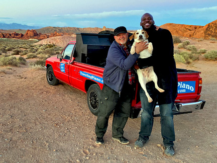 He gave me his card. We really had no time to talk or do anything because he was running to get a photo before the sunset. The whole exchange was intriging. I drove to another spot where I could sit in the truck and look at the scenery until it got dark because it was too cold to get out of the truck! A guy was there in an open convertible taking pictures and was about to take one of the Traveling Piano. He looked so like he was having such a joyful life experience, visiting Las Vegas, renting a hot car that he was going to enjoy cold weather or not... and I just had to add to his experience so I got out of the truck, pulled the cover off again and we had some fun with music and pictures. Another guy showed up and we kept going. As the two of them connected, we threw the piano cover back on and I got out of there before I froze to death.