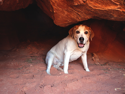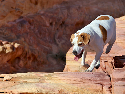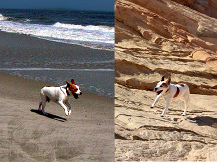 I'm taking it easy today after yesterday. Mo and I had total fun together. He actually had a full grin on for much of the day with teeth showing. Of course, he was feeding off my energy for him. While hiking we almost got into trouble finding ourselves an a rock ledge very high up on a cliff. Physically, what I could do a year ago I can no longer do. There is no way to know until I am in such a situation where its like, uh oh. We were stuck with no way up or down on a very narrow ledge, but we managed. Mo was very cooperative in not moving and letting me lift and guide him up over the ledge. He had half a ham and cheese sandwich in the afternoon and half a pastrami sandwich at night, lol. I've never given him something like that before or as much. Hey, you only turn ten years of age once! I found a picture from his 1st Birthday at the New Jersey shore where he stood with his hind legs planted on the ground while he hopped up and down with his front legs in joy. It shows the same jubilant energy as a picture I took yesterday of him running free on desert rock where we were.