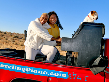 I've been creating online displays for the Traveling Piano Art Photo Gallery. It is a lot of work and really taking away from Traveling Piano time, that and raising funds. The asking for contribution in dribbles and drabs just cannot go on forever. I need the big guns as in a producer, publicist, representation, investors but looking for all that is more than full time in of itself. Everyday, I go back and forth with trying to decide what I want to do most. One backer to just keep me going would be nice... I had that for two years when I first moved here, still it was not enough to fix the truck, get new clothes, etc... Many times throughout this blog I have said how I know I am doing exactly what I should be doing in life. It still feels that way. You will be surprised at what that is. What I should be doing most is exactly what I am doing and that is to enjoy Mo as much as possible while he is still in my life. Next... the Traveling Piano's work but more so these days looking for financial sustainability. It is all good. I'm almost a year behind in processing photos for this website gallery of people playing on the piano!!! Todays photos are from people we met in the dessert on Mo's Birthday.