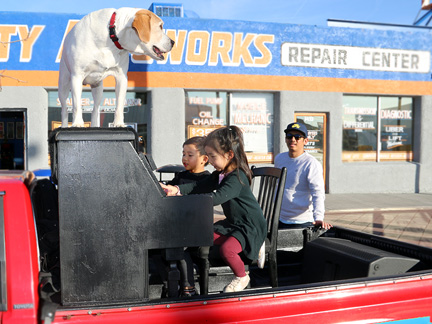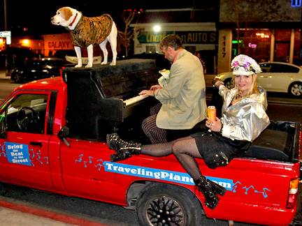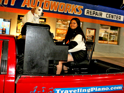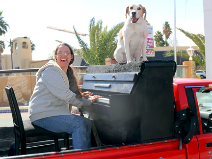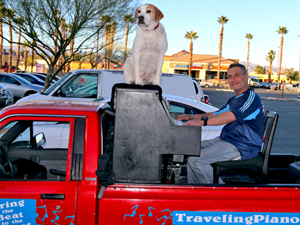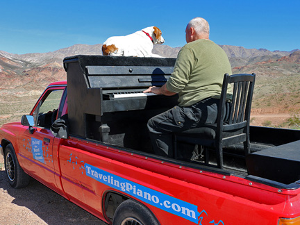 This last day of March! I want to post a few photos of the Traveling Piano from last month. There can not be more than five duplicates on this entire website of people experiencing musical, fun, friendship and respect. Thats amazing considering how many photos there are. At least 90,000 people have been on the Traveling Piano seat. I would be a millionaire several times over if they all gave a few bucks but that was not the purpose, eh? I just want to unload and say something so I don't own it all by myself. After walking the streets last night I thought, in my wildest of dreams could I have ever imagined in my life's master plan, spending the last stage of my life at age 65 walking the streets handing out... because that is all I could get my hands on... nothing but bread and water to people literally dying on the sidewalks of Las Vegas... not.