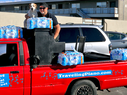 My new friend Max from McKee's Ranch, an urban ranch right off the Las Vegas Strip, he filled the Traveling Piano again with food and water to take out to the homeless. He and his wife made about 80 peanut butter and jelly sandwiches, I took about five cases of water, they gave me raw carrots and small bags of fresh broccoli, a huge about of Panera loaves of bread, sweet rolls and bagels, snakes etc... I took it all right out. Stopped to do the live stream, dedicated it to those in Nova Scotia reeling from the recent gun massacre there and then went out into the night to keep giving out the food. It has to be done while it was all fresh. People on the streets are very hungry. The usual resources no longer exist. They must travel long distances in the city on foot or by bus if they have a pass to get any food.
