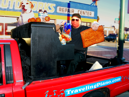 There was a shooting at my Art Gallery (closed because of the virus) today. No one was arrested, no one hurt but man is that place crazy. The entire neighborhood I live in is crazy. The neighborhood watch I've joined is keeping an eye on everything but it does not stop the craziness. Max, the guy who gave me food back to take out onto the streets once before, gave me another truck load today. Someone donated to him $650 bucks worth of water, cereal, muffins, donuts, chips, canned tuna and more for me to take to the streets so of course I went crazy with that into the night with the Traveling Piano. I've been wearing a protective face mask more and more. Someone in my apartment complex has been trying to seal my license plate every night. They get one screw off one night, I put it back on and then the next night they took off the other screw... well, friends of mine from the street booby trapped it today by replacing the screws and then gluing on metal shavings to them. Hopefully when they get those shavings in their hands that will be a deterrent!