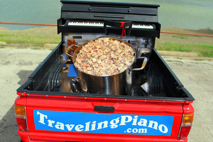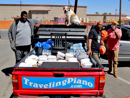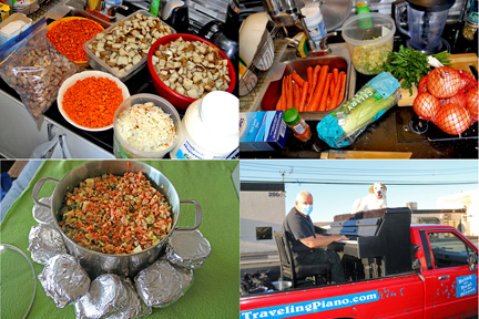 I took out the truck to give out food even though it is giving me a lot of trouble and could break down without notice. I spent all day making five gallons of potato/chicken salad with potatoes, chicken, celery, carrot, onion, salt, pepper, Italian seasoning, sour cream and mayo... put it all in in cups with forks... organized, prepped, cooked, mixed, served with my buddy Mo to friends living on the streets from the Traveling Piano... it took a total of 10 hours non-stop from start to finish.