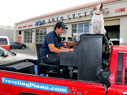This morning the couple, Jim and Annie, they made a sizable contribution through my website to help pay for the repairs on top of everything they already did. I dumped the truck unexpectedly on the repair guys at R&R Auto Systems here in Las Vegas who already had a full schedule for today. It is Friday and they are closed for the weekend. The truck started up for them enough to back it up an incline and into the garage. The battery was fried with only 4 volts showing. The trucks' alternator had been disconnected from the battery. How I was able to ride the distance on the battery alone to just inside the city where I could get a tow is a miracle and unexplainable. Same goes for how the truck started for them this morning. Chris the owner of the shop took it on himself to get the truck running before he closed and then charged me only for the battery. I'll take it back on Monday and he will go through all the wiring for the piano batteries and figure out the system to hook up to the main battery for charging.