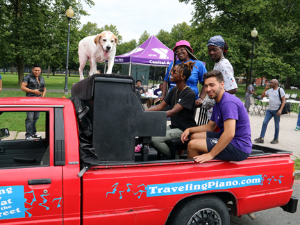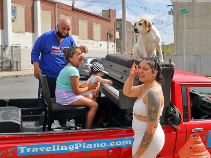 Tomorrow, it is supposed to rain and I plan to take a day off to work but with the fundraising, photo processing, this blog, etc... I'll still need to do, is that a day off? Lol, on the way, several glitches began to take over in my mind as in alternatives to the beach and questioning whether I should even continue in that direction. As we were close to Trenton, New Jersey, the city began to dominate my mind and I decided to stop and do some playing there with the Traveling Piano. It has been on my mind to do that since I arrived back east. I was driving down random streets feeling my way into the situation while reminding myself of intent... that of musical fun, friendship and respect... empowerment, inspiration, the idea of strangers becoming less afraid of each other and then I saw a tent set up on the sidewalk at a local park. Food was being given away and tables for COVID vaccinations were being set up. I spent about a half hour there and then continued to find a street with homeless people hanging out. I stopped there also and then on a downtown neighborhood street with a lot of noise and people hanging out. That was fun and good for the neighborhood kids too.