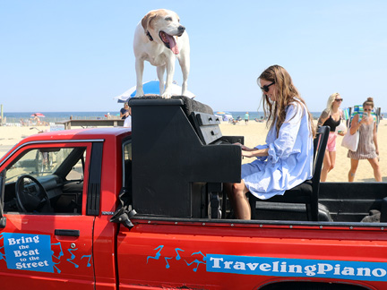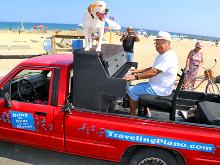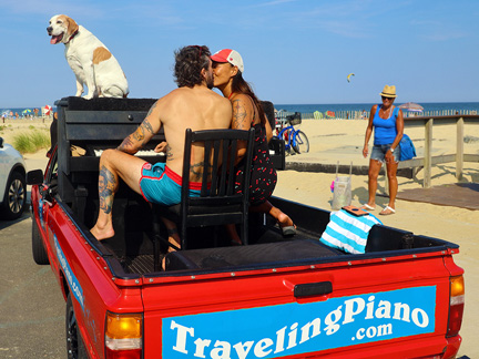 I am like, "did that just happen?" Mo and I got going at noon and drove to the beach which was an hour and a half away. It felt like it had been a life time since being at the Jersey Shore. We drove down the main beach road and then pulled into a bay area to get out and stretch. I almost cried with emotion in being there. The beach is my favorite place, the air and the environment, the day was perfect. Of course there were a lot of people around and I had to constantly adjust to that fact to share the experience. Usually I go to the beach when no one is around. I've been very lucky that way. As I drove the length, I began to scope out spots where I could get a photo of the Traveling Piano with the sand and ocean. We found a perfect spot right on the boarder of Belmar and Spring Lake Heights. I was going to get a photo and move on but ended up spending the entire time there. Everyone was easy going, the people, meter guy, rent-a-cops, the real police, the beach ticket takers... I kept waiting for someone to tell me to move on but it did not happen. We we're very welcomed.