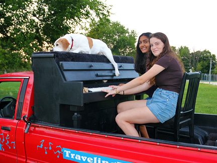 With the weather so perfect, not going outside today would have created a lot of guilt! If nothing else, I had to take Mo for a walk. Also, of course I wanted to create some music. We just began driving and found a park that I had passed many times and was curious about. There were signs, "no dogs" "no bikes" signs with lists of "no's." Just a community park but, it had a guard. Where I was without question was not guard worthy, lol! I began to realize those in control of this park are totally anal and paranoid. Two young girls came over to give me a dollar. As usual I said no thanks and instead invited them up onto the piano. Once up into the truck bed they freaked as though I was a predator. They said they had to get back to their mom. I said, bring her over with you. Mo and I went for a walk. A bunch of kids were under a picnic housing and engaged with us through calling Mo so we went over. There were about eight kids and just quietly hanging out not. They said is was a birthday party, a girl there turned eighteen. In thinking they needed a little shot of energy I told them to come over to the parking lot for a surprise.
