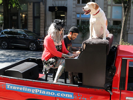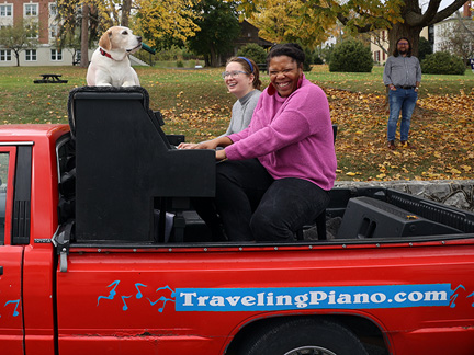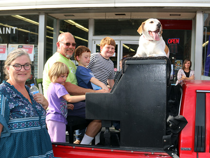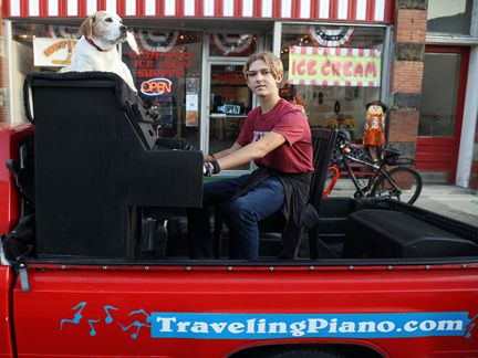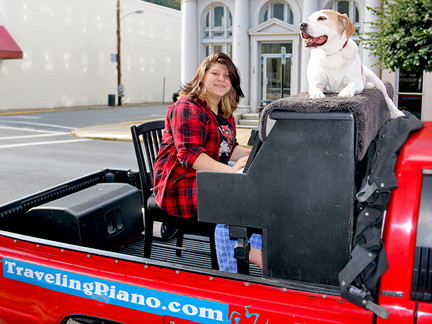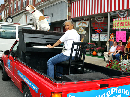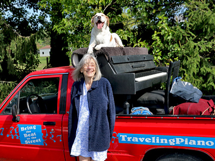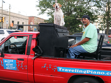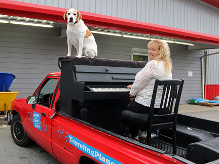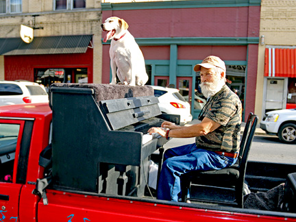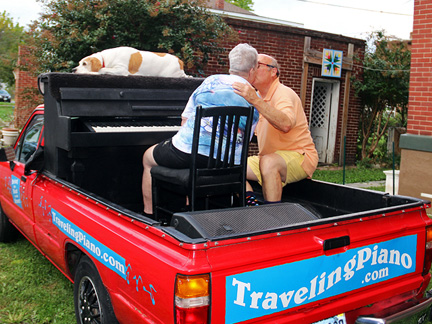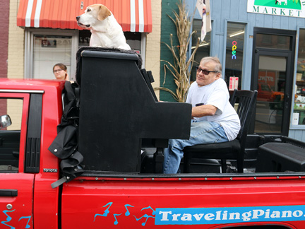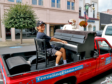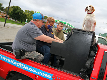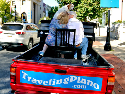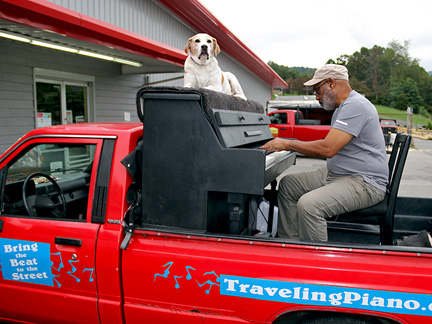 Bev is a quilter. Quilting is big here in this area of Virginia. She is entering a piece in an arts show and asked if I would drop it off for her. The neighbor across the street Wayne, he went with me. It was another cloudy day with not many people around and I just pulled up to a curb, dropped off the quilt for the show and began to create some music. A few people interacted with us but the best part of it all was Wayne getting into the truck to play. He is in his seventies and has had a severe curvature of the spine since birth but... that did not stop him from climbing into the truck and onto the piano. Getting down from the truck can be even more troublesome for people. When those like Wayne "go for it" in spite of difficulties or what anyone else may think, or they get past their inhibitions to join me through partaking in my journey, that inspires me greatly. It empowers me to keep moving and "doing" myself no matter what.
