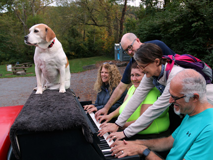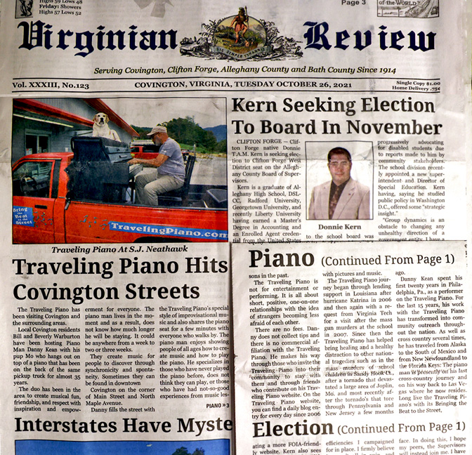 We arrived in Covington, Virginia to stay with a facebook friend Bill and his wife Bev. We met for the first time and we all ate on the front porch of a major old house with inside woodwork to die for! Bev's close friend, another guest staying in the house and a neighbor from across the street ate with us. Strangers becoming less afraid of each other, thats the name of the game here. It works both ways and better for me when it is on someone else's terms. They are sharing their home, hospitality and food with us and we adjust as best we can with full gratitude and appreciation. I've not done the journey in this manor since 2016. As an older man it is much more difficult for sure! Mo and I get to share the Traveling Piano with our hosts, their friends, neighbors and the community at large. Musical fun, friendship and respect with empowerment and inspiration.