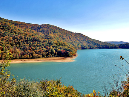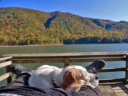 Mo and I drove an hour away to a remote lake in the Allegheny Highlands named Moomaw. It is situated in the George Washington National Forest. I did not know if the truck would make it and when we began driving on a winding uphill, one lane dirt road with a high wall on one side and a cliff that dropped off far into a river below on the other side well, my thought was "I've done these kinds of roads before just not with the truck as old as it is and the clutch grinding severely as I change gears and also with an undeniable engine noise. If I had known the ride was in such a remote area I would not have gone. And, on roads like that, there is no turning around. I was hoping the clutch problem would just disappear as it has in the past but it did not. There was little energy for hiking once we got there and so we found a picnic table on the water and just laid in the sun listening to the water, wind and the trees. Mo laid between my legs in bliss.