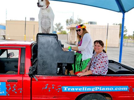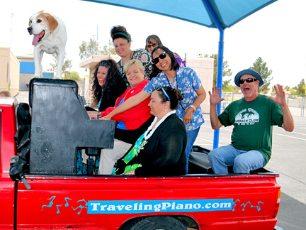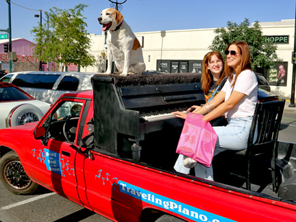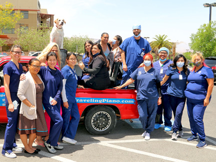 Over the last two months, we played outside a cancer treatment center here in Las Vegas for over thirty days. That was a five day a week commitment which was more than fulfilling. For the first time ever I got up with an alarm clock and with a schedule in the mornings. Of course, people really appreciated that. There was the consistency of seeing us as people arrived for treatment and they could take our love with them as they departed. The Traveling Piano was a great distraction from worries and discomfort. We took a ten hour drive to Sacramento California and back to create some validation, worth and healing for family, friends and neighbors of a mass shooting there. During teacher/staff appreciation week here in Las Vegas the Traveling Piano surprised a couple of elementary schools and their teachers with a visit.