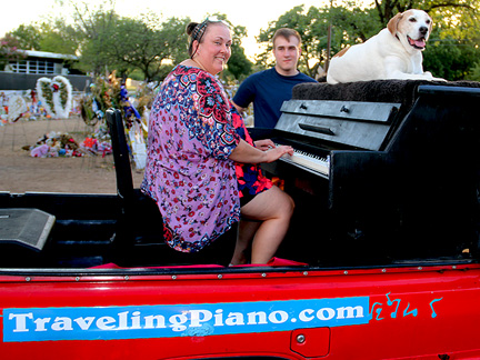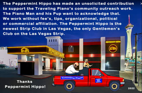 Music does in fact bring people together and without controversy. The Traveling Piano makes a difference because it is without fees, tips, political, organizational, commercial agenda... Traveling Piano Pup Mo and I are here to share some love for humanity. This is happening through small individual donations from our friends. We can use your help to keep going and also to get us home... to Las Vegas. Paypal me direct: Paypal Direct or here on this website: Contribution Link And Venmo: @travelingpiano - 215 639 9378 or email me for another way.