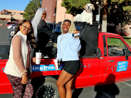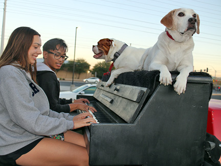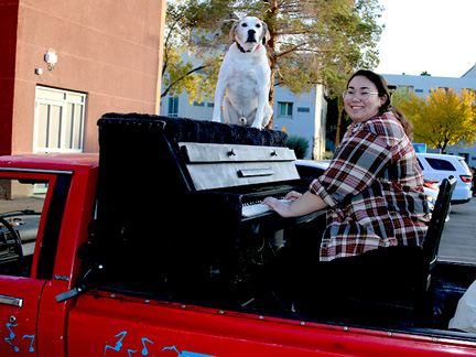 Wow, was I zonked out. After sleeping thirteen hours which was needed, I got up realizing that not much time was left for sunlight. So I had my coffee and just drove to the university campus while telling myself I can spend an hour and a half there. At first the truck would not start again. I sprayed cleaner (a lot, twice) into the engine filter area and that did the trick. In not knowing where I was going to stop, while passing a few school buildings I noticed a little activity so I drove towards it and there I found a small memorial. There were about eight service dogs with their handlers and a small group of people with crosses. That was it, no one else. People just do what they do and they are well funded to just fly allover the country to different tragedies to make a statement. I should be so funded! Lol, anyway I was about to spend some time with them when the local television station KSNV called to ask if I can be around for them to create a television segment with the Traveling Piano.