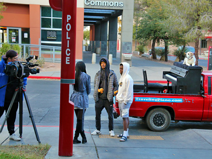 I had sent them a press release yesterday saying the Traveling Piano fundraising plans I was about to embark on we're derailed by the gun slaughter taking priority and I need help. They created two segments. The early news segment was about what I am doing at UNLV and for the later news spot they created another segment about my need for support. They use the Traveling Piano as the lead in for both shows and the first segment as a lead for the second. I cannot not thank them enough for doing that. The last thing I would want is to confuse my being at the school for the teachers and students with... fundraising. They helped to keep my agendas separate. Thank you, thank you, thank you KSNV! In the meanwhile I had some significant and fun interactions with students and the Traveling Piano. These young students are most vulnerable right now, many more than they realize with this tragedy right where they live and study. They must now adapt to living in a place where people we're slaughtered like... just a few days ago.