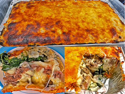 ... small sink and practically no counter space I made a Shepherds Pie with pie crust made for the very first time in my life. I used flour, water, salt and butter for the bottom layer... added in mashed potatoes and on top of that spinach. Then, seasoned hamburger with salt, pepper, onion powder, worcestershire sauce and mixed herbs, cheese on top of that, mushrooms with grated onion next, and for the topping... another layer of cheese cooked to a crisp. I wanted to add corn but it was already piled 6" high and the pan 2'x3'! I found a wood board to hold the 30lb pie and took it over to my friend Pavel who cooked it in his pizza over while we checked on it every five minutes. What a work of art! Success! A lot of work. The pizza oven did the trick at 600 degrees. Healthy, filling, fresh and ready to eat for the next month or two. Good thing I have a decent size freezer!