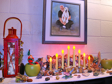I could not do anything today. Not even go online or phone anyone. In fact after the last few days when I get home I can do nothing, can't even think. Christmas, I am having my own little Christmas. There are actually two Christmas decorations I have up all year round. It was an elf I found and a Christmas decorated antique train lantern given to me a few years ago. There are a few other decorations and I still have my real Christmas pumpkin from Halloween. My fall decorations stay up through Christmas. (not many) How real is a pumpkin that lasts for months indoors without going bad? Lol, so much for genetically engineered fruit and vegetables. I find comfort in my watercolor paintings of bot Mo and Bo (my past pup) and also my crystals and rocks. I've been listening to and filing Christmas Music ( I have a lot) which I enjoy doing. And then there is Mo... he is my constant Christmas, my happiness, my gratitude, my Christmas joy in awakening to every new day.