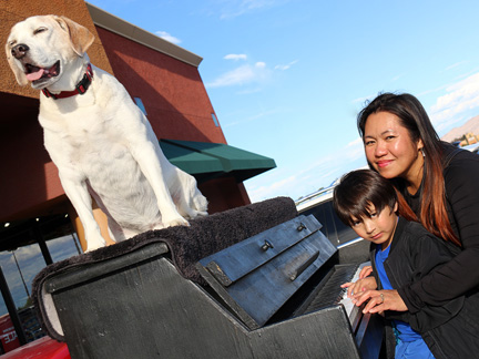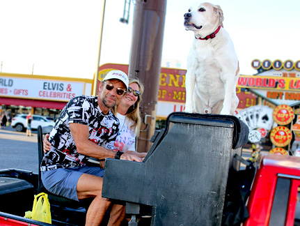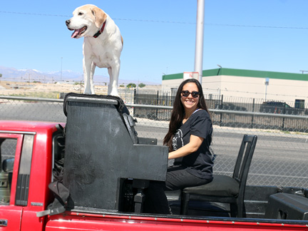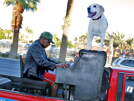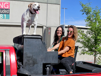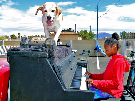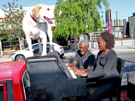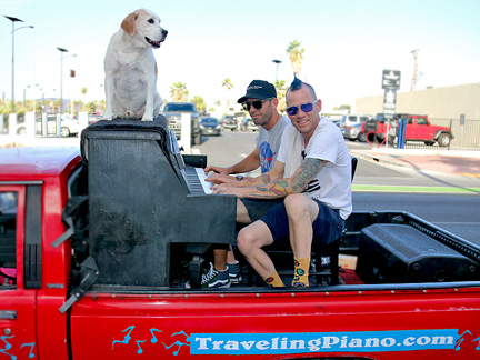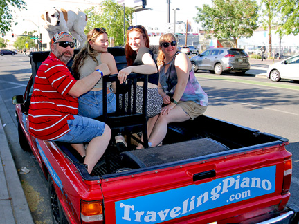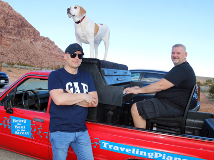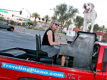 Mo and I connected with Phyllis Tilley today. Her stage name is Philly and she is a consummate Las Vegas lounge, lady piano player, singer and dueling pianist. I drove her down alleys and also on Main Street while she played with Mo on top of the piano. I wanted to see if Mo could still balance himself on top of the piano while the truck was moving as we have done for so many years in the past. With his time nearing the end of being on top of the piano because of his age, every opportunity to enjoy it is important. He would not lay down and paced back and forth while we were riding along which made Philly super nervous. He loved it as when we stopped he gave me a lick on the head which is a rare sign of pleasure. As we drove past the most crowded brewery a roar came in unison from everyone inside over what they were seeing and hearing along with the surprise of seeing the Traveling Piano passing by which many people know about. I offered Phillis the Traveling Piano to use should she get a booking that would work for it. She had to be a bit traumatized by the experience. I hope she enjoyed it. Playing for the first time on a moving truck is draining. The music has to be constant and strong and acute awareness is needed for what is happening in the surroundings.