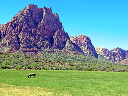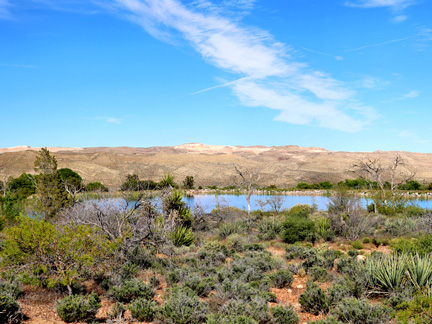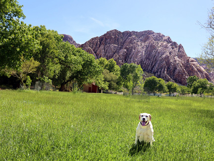 Mo and I found heaven today. We just laid in foot high soft green grass under the sun listening to the leaves blowing from the trees. The feeling was that of a cool, breezy, dry, late spring day. This, just three miles south of Redrock Canyon just outside of Las Vegas less than an hour from where we live. I went to get water from the truck and Mo started to run in the opposite direction for the first time ever. No... no... I'm not leaving, lol! Our hiking days have ended. He is too old now. This will be a perfect place to just sit in and enjoy nature while Mo eats grass out the wazoo. There are plenty of trees for shade, the truck close by, hardly any people around. Ahh the desert! And there was a lake also although it was fenced off and barely visible.