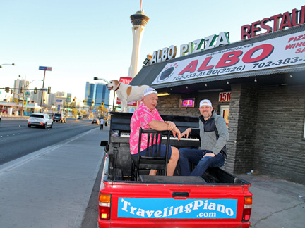 Weird, there was no getting up this morning until I could get up. I was totally exhausted until I was able to wake. Mo and I were going to head to my friends Eric and Mary but beginning tomorrow the temperatures are going to start hitting the nineties. While still possible we headed to the streets with the Traveling Piano. First stop was by friends I know living on the sidewalks to create some music for them until... the piano's sound battery went dead. The convertor turned on somehow overnight (it does that) and along with the present heat, the battery drained. I drove around to recharge and ended up on the corner of Sahara and Las Vegas Blvd until security came running over. The spot was perfect but the owner of the souvenir store there is a jerk and totally territorial. After a while driving around to find another good spot, we ended up on the Strip outside Albo's pizza.