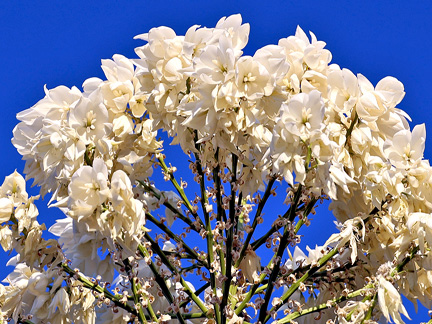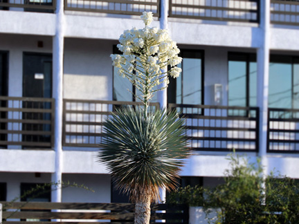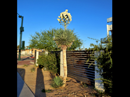 We hung out at my friends Eric and Mary's place by their pool today. I over extended myself with the Traveling Piano work over the last three days and need to take it easy now. Once home I found a beaked yucca (rostrata) on my street, never saw it bloom before. It is totally unique with flowers delicate, full and lush. It is stick like about 10' tall with a green ball on top and then out of the top of the green ball comes the white flowers! It is amazing to see.