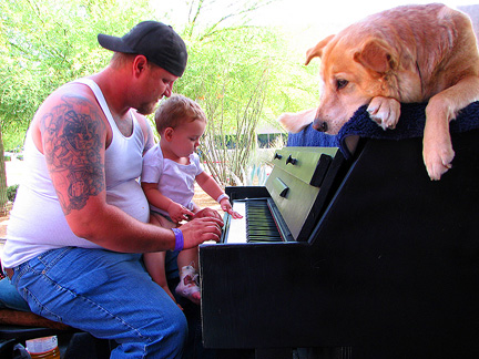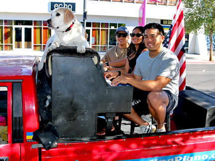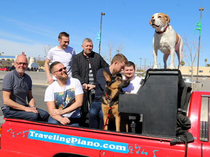 From the start in 1987 Piano Man Danny Kean, that would be me, I have worked with a piano in the back of the same pickup truck along with two pups. Bo-ner was my first dog ever who stayed with me for over 15 years and now Mo, he is heading towards the 16 year mark. My two pups have served as faithful companions while hanging out on top of the Traveling Piano giving comfort and joy to everyone they meet. Concerning my own age, in July of 2025 I turned seventy years old! Ahh... time rolls on.