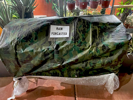I got up to take a pee at 7:00am while thinking through the blinds that its really dark out for 7am. Soon afterwards I heard a short rubble and thought I hope thats not rain. The clouds looked kind of rainy-ish in the dark when I took out Mo last night. And then, I heard the drip, drip, drip of the overhang on the walkway outside my door. It was raining steady. That escalated to a full scale thunderstorm and I thought... oh, well... there is nothingI can do about the Community Traveling Pianos getting soaked around town. This was the first full fledged downpour on them. I've been able to put covers on before. I'm too sick, old and tired to care, really and what good would caring do? It was totally out of my hands.