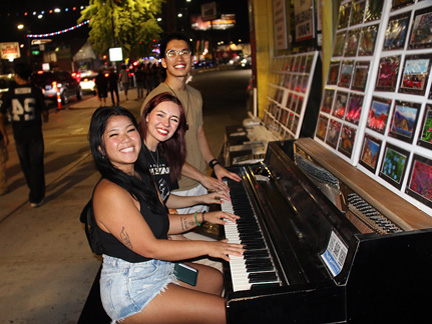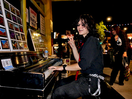 It was First Friday, a monthly celebration on the streets of Downtown Las Vegas and now that the weather is better the place was packed... with kids. Wow, I am getting old! While walking around checking on the five Community Traveling Piano's that are out on the streets, I am finding that they all are in need of tuning. That will be a constant issue. They are reaching the point of musical notes not being distinguishable. The piano's are now being used in movies. I came across a film crew using one and the actor was banging the shit out of it in an anger scene. My thinking was not quick enough to tell them if they are going to bang the piano out of tune they need to pay for a tuning. People in general do not respect public property and also do not think about how a piano gets destroyed and also, do not realize the piano's belong to me along with all the responsibility that goes along with that.