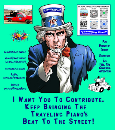 The Traveling Piano's Final Fundraiser Spotfund - Venmo: Dan Kean @TravelingPiano 2156399378 - PayPal Me for the Traveling Piano - CashApp: $travelingpiano - Contribution Page - Email me for snail mail.