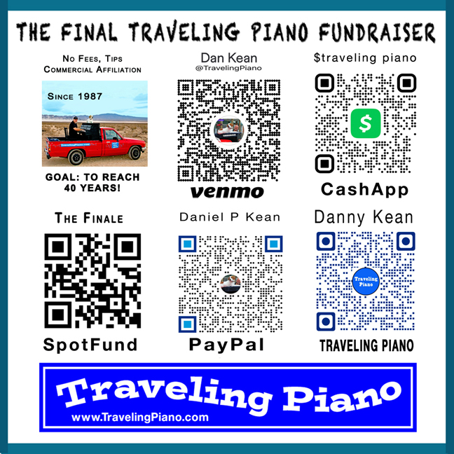 The Traveling Piano's Final Fundraiser Spotfund - Venmo: Dan Kean @TravelingPiano 2156399378 - PayPal Me for the Traveling Piano - CashApp: $travelingpiano - Contribution Page - Email me for snail mail.