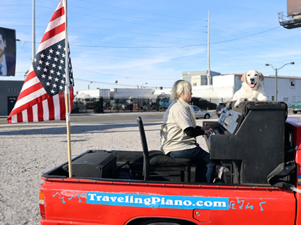 Today was to be a day of protest, a nationwide stop of everything at 2PM for like 5 minutes? Just go outside and bang some pots and pans. Wake people up to the fact that something is happening. Show a sign of solidarity. Arrange your work break for it. Gather in groups. Well, there was nothing that I saw anywhere including on media. But Mo and I were out protesting. We went to the busy corner of Main St and Charleston Blvd in Downtown Las Vegas where there was a lot of visibility. Mo was able to hang out on top of the piano for the two hours we were there. I blew out the area with musical sound louder than I can remember projecting. My music for the mood and statement of protest is becoming stronger and stronger every time I do it. We interacted with a few people. I gave a woman on the street who was passing by a sleeping bag and she broke down crying in appreciation.