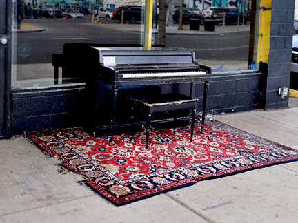 A homeless guy I know went and found an old oriental rug in the trash and put it under one of the Community Traveling Piano's on the sidewalk. That just made me feel so good. The respect, desire to care for, the fun. When it had rained all the hammers and felts inside swelled up and most all the notes stuck on all of the pianos. I thought once they all dried out it might be ok and... they are all ok. Of course they keep going out of tune more and more. Three out of seven pianos I put out on the street, still there, still playable since June! Every day and every night people play on them. If only I could keep them in tune. I have a tuning kit... get the time to learn, practice and tune... the time to do that has not happening.