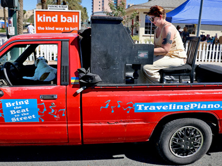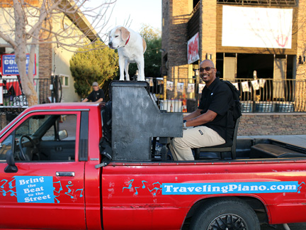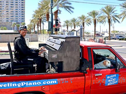 Our friends at Pawsitive Difference Pet Rescue had an adoption event today here in Las Vegas and so of course Mo and I were there to lend our support with the Traveling Piano. Mo stayed in the truck cab as he can't stay on the piano for any length of time. Those days are gone. The day was perfect. At this time of the year the sun is not so hot. Once the warm weather comes, the temperature can be bearable but the sun is still too strong. Especially for my bald head and Mo's age. He walked around a little and we spent about two hours interacting with people just walking by on the street as well as attendees.