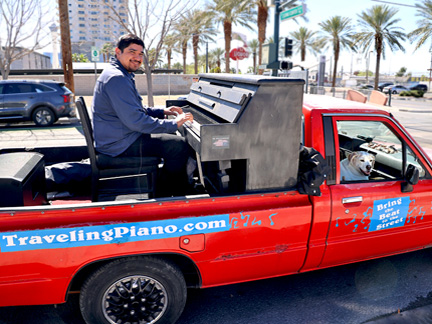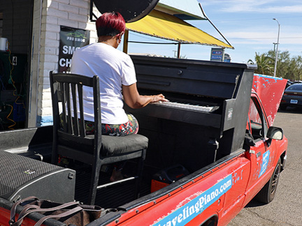 It took for ever to get around to registering the Traveling Piano truck for this year. Knowing there is a grace period for late registration felt good until, I found out there is no longer a grace period. On top of that, the state charges a late fee daily now. Shitheads. I was holding on hoping the smog test would pass. It did not so, I had to go back to last years guy to fix it just long enough to pass. $$$$. So, there was the registration fee, late fee, two smog test fees and fee to fix it long enough to pass. Total $357.50 The first smog test guy, I had told I would share the Traveling Piano with him when we were done. He charged me $30. The entire time I was interacting with him I was distracted with thoughts of "please don't charge me the money for a failed test" but as is with the Traveling Piano... I promised him the experience so... it is what it is and he charged me. Same with the smog adjustment guy... it was cash so please give me a break. Nada. Although, if it was in any other state I would never have passed the inspection needs they demand to register a vehicle. That is one "really" good thing about Nevada. The smog test is the only inspection needed. This is crucial because, nothing on the dashboard works, the front window is cracked and held on with duct tape and much more.