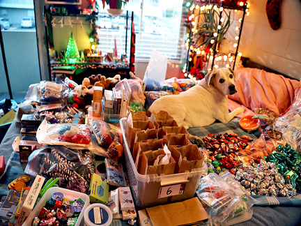 I leaned about an auction house that gets rid of Amazon returns. The place is like a huge warehouse with a $6 section, $3 dollar section and a $1 dollar section of returns that people pick through in and out of boxes. I asked the manager what they do with everything that no one wants. He showed me that they stuff shopping carts with everything and sell them for $15 a cart. I asked if I could get the unwanted stuff for my Christmas Homeless project and he offered for me to go through the bins to collect a shopping carts worth. Wow! What a gold mine... I collected, snack bars, candy, toys, and about $700 worth of other stuff all for $15! That felt very providential as I do not have it in me to push the fundraising hard enough and there is no other resource to get what I need. Now to wrap it all. My friend Eric contributed for the wrapping paper, ribbon and tape. I even found boxes and bags to stuff small trunkets into. A few contributions paid for $300 worth of candy.
